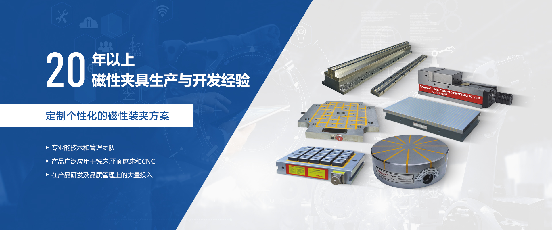 紹興市威克精密機械有限公司是一家專業從事磁性夾具生產與開發的企業,擁有20年以上的行業經驗。威克產品系列包括電磁吸盤、電控永磁吸盤、永磁吸盤、電永磁快速換模系統、真空吸盤、磁力吊重器、充退磁控制器、精密虎鉗、手轉工具萬力、磨床法蘭、沖子成型器、銑刀研磨機、自動攻絲機、倒角機、磁性座、機床附件等。我們的產品廣泛應用于銑床,平面磨床和CNC......